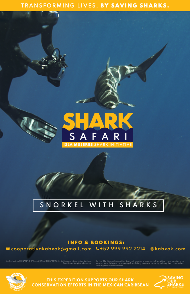 What makes Kab Xok’s Shark Safari unique is not only the in-water experience, but also the conservation model that supports it: the Fundación Saving Our Sharks and its Iniciativa Tiburón Isla Mujeres.