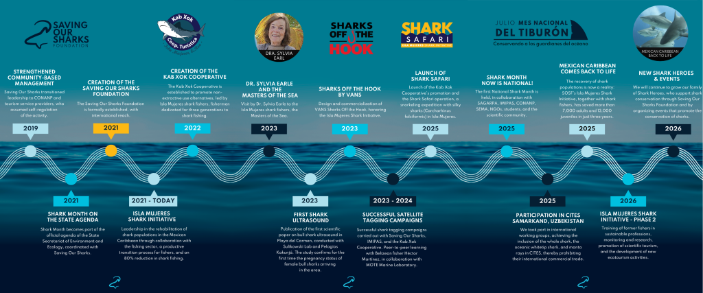 En 2021 se constituye la Fundación Saving Our Sharks con alcance internacional y su Iniciativa Tiburón de Isla Mujeres, enfocada en la rehabilitación de poblaciones mediante la conversión productiva del sector pesquero y la reducción significativa de la pesca de tiburón. Dando como resultado la creación de la Cooperativa Kab Xok, la cual representa un cambio histórico: pescadores tiburoneros, con generaciones de experiencia, migran hacia modelos de aprovechamiento no extractivo como el turismo sostenible, convirtiéndose en Maestros del Mar, guiados y capacitados por Saving our Sharks.
