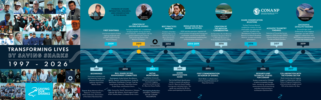 This timeline tells more than a sequence of events—it reflects a profound cultural transformation. From extraction to protection, from fear to respect, and from fishing to sustainable tourism. Thanks to the commitment of the community and its partners, sharks in the Mexican Caribbean now have a real chance of survival, and with them, the balance of the ocean and our shared future.